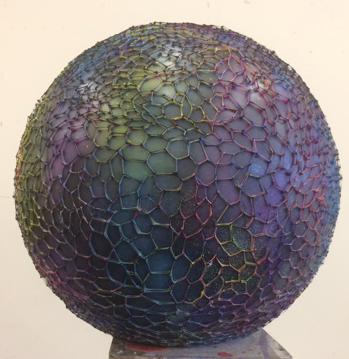 Dual printing allows the 3d printer to print 3d shapes in one material and print support material in a dissolvable material , allowing complex organic shapes to be printed. Therefore I had to produce the print by a company used to print models for the special FX industry. Because of the additive printing process the print has an interesting perlescant aspect I am told is close to the coating covering pollen tetrads in plants so I decided not to colour or spray paint the model in the end. I am hoping that this model will be a useful model for teaching the subject of plant research. The concept behind the piece titled “Cross pollination” is inspired by natural patterns that appear on many levels from microscopic surface of a pollen grain , leaf structures, to crystalline volcanic rock formations. It was directly inspired by my discussion with Prof Rod Scott, it is also an development from the Tetrad 3d print and indeed I used 3d printing material to model the patterns themselves.